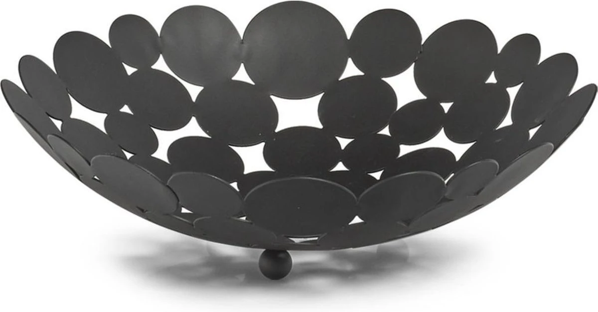 Een zwarte ronde fruitschaal/fruitmand. De deels open schaal zorgt voor een constante luchtcirculatie waardoor het fruit minder snel overrijp is.