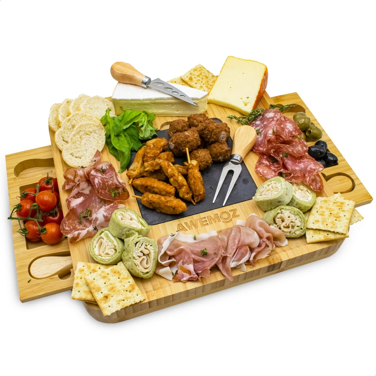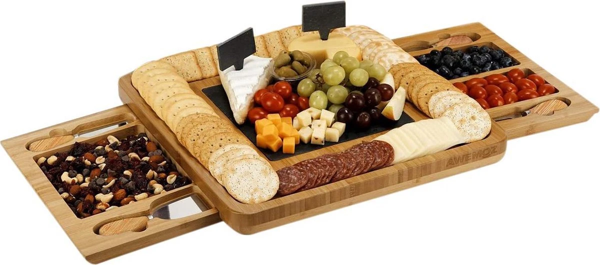 Presenteer jouw eten en geniet met deze duurzame bamboe borrelplank van Awemoz! Deze luxe set is een ware sfeermaker, ideaal voor speciale gelegenheden, gemaakt van duurzaam materiaal en geeft een natuurlijke look & feel. De set is voorzien van luxe kaasplank met 2 lades waardoor de set extra grootte heeft. Daarnaast bevat de set 4 kaasmessen en 1 keramische plaat. Ook erg geschikt voor het serveren van andere etenswaren als tapas.