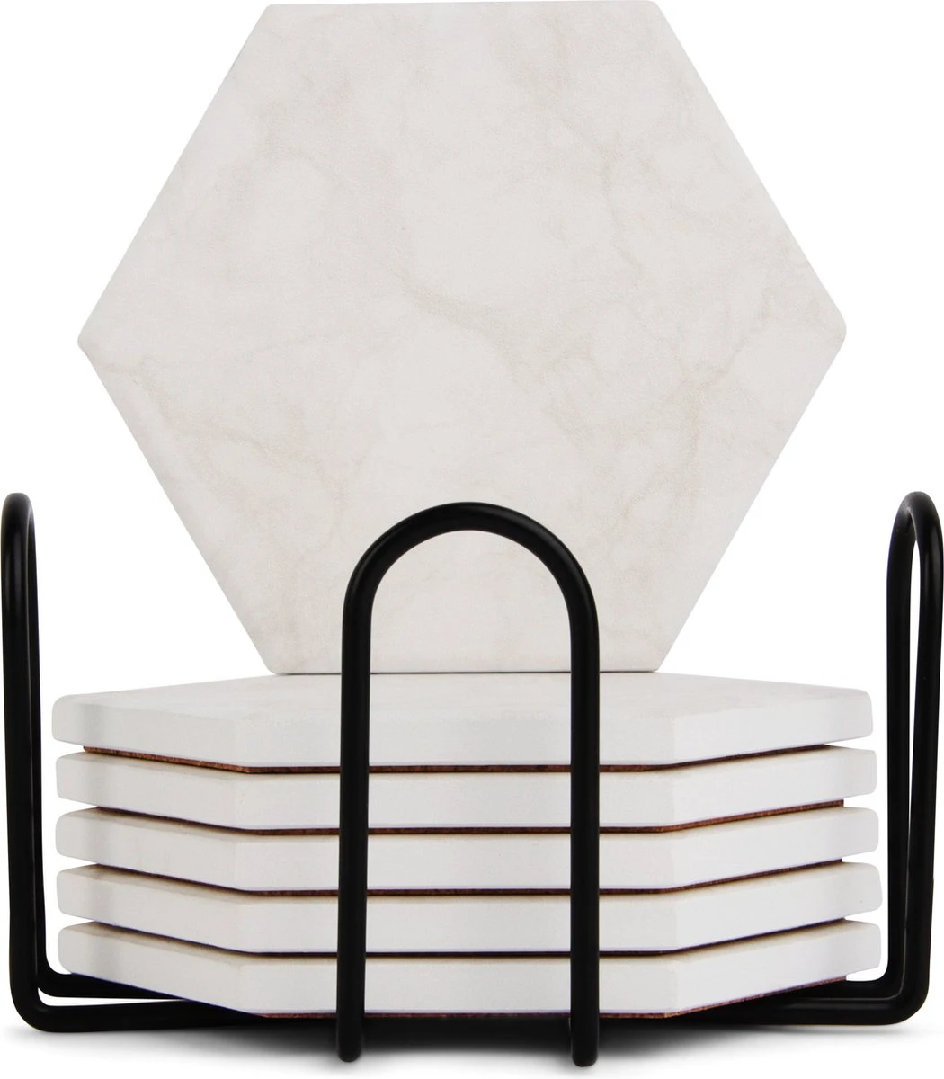 - Met metalen houder – Om de onderzetters op een stijlvolle manier op te kunnen bergen wordt de set geleverd met een zwarte metalen houder.