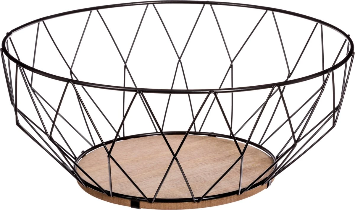 Mooie fruitschaal om uw interieur en zeker uw keuken mee te verfraaien.Deze fruitschaal past in elk interieur, of het nu modern, klassiek, rustiek of ingetogen is. De fruitschaal heeft een houten basis en de mand is gemaakt van zwart metaal. Hij past ook in de eetkamer of op het dressoir. Omdat de fruitschaal rond is, is hij ruim genoeg om er veel fruit in te bewaren. Toch is hij niet te groot en neemt hij niet te veel plaats in.