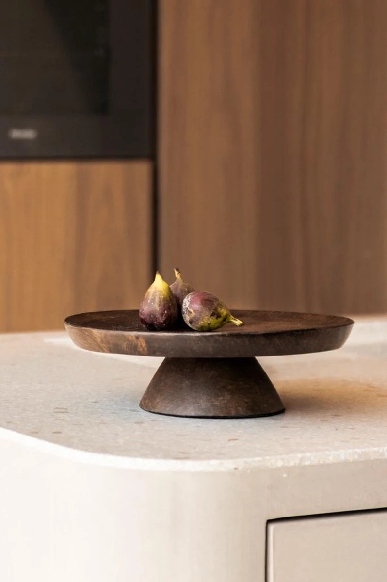 De taarthouder is gemaakt van massief mangohout, duurzaam en uniek in nerf en kleur. De diameter is 30 cm en de hoogte 9 cm. Mag niet in de vaatwasser.