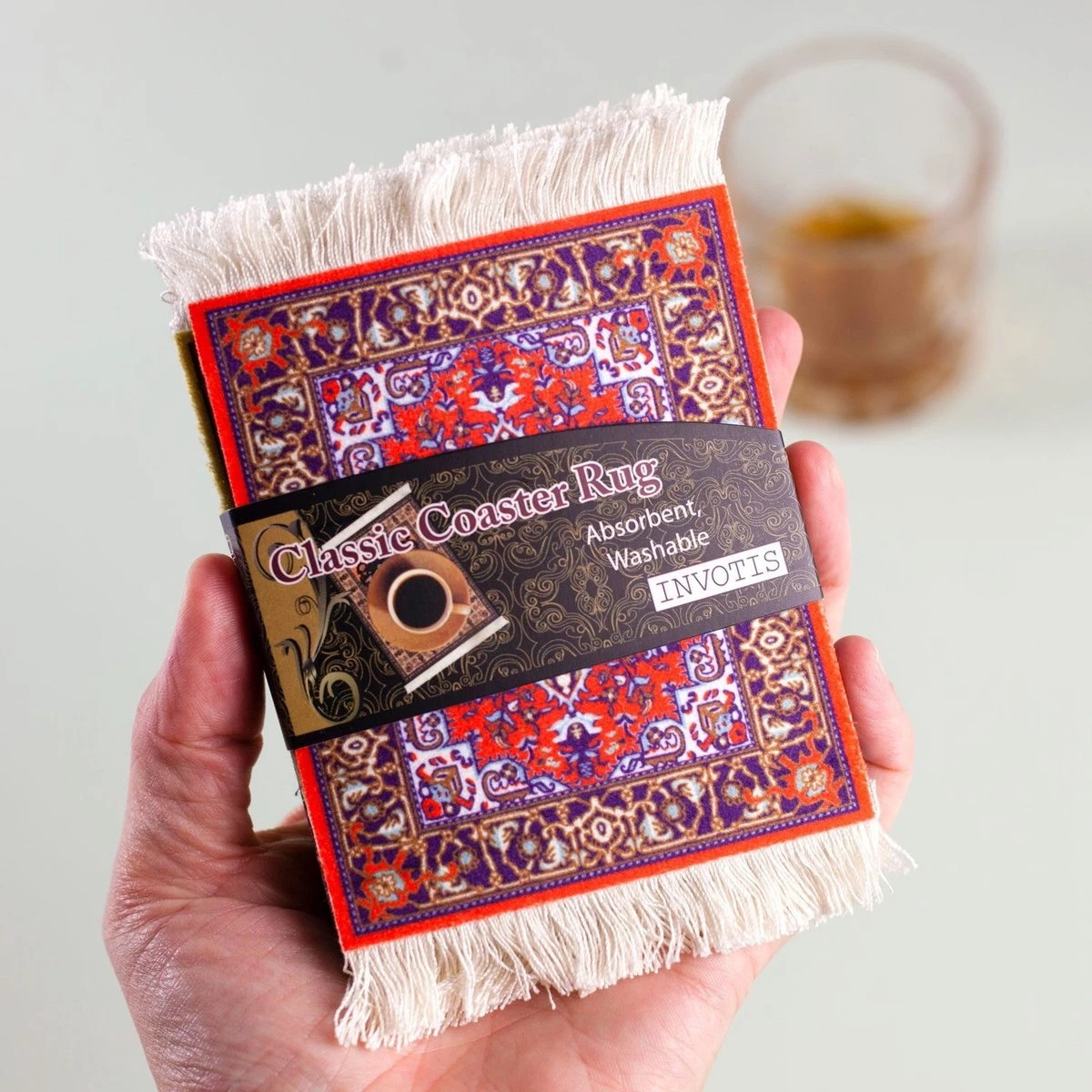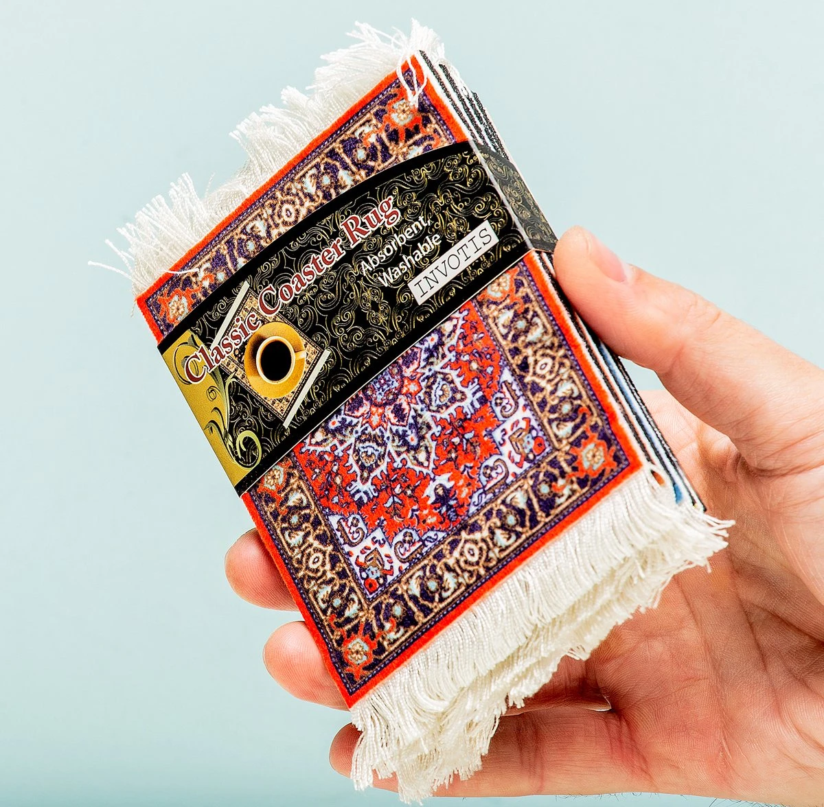 Perzisch tapijt onderzetters van Invotis. Onderzetters die eruitzien als Perzisch tapijt. In de set zitten vier onderzetters met elk in een ander motief en kleur. De tapijt onderzetters zijn gemaakt van stof en rubber en kunnen op de hand worden uitgewassen. De onderzetters beschermen de tafel tegen kringen, vlekken en krassen van glazen en mokken. Zorgt voor een kleurrijke toevoeging in de woonkamer. Afmeting: 13 x 9 centimeter.