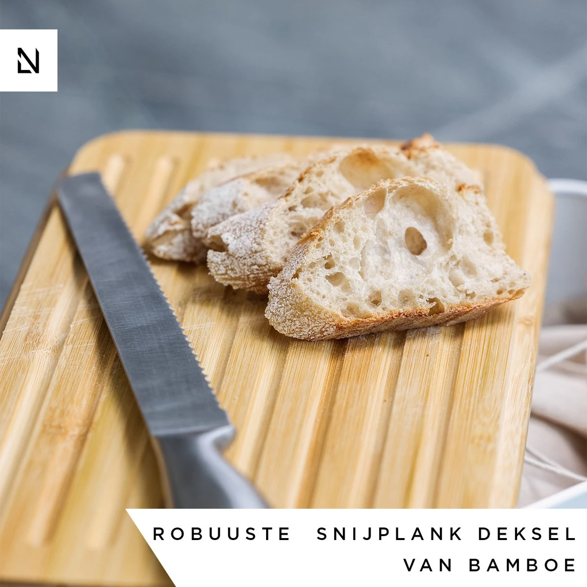 De extra stevige bamboe deksel zorgt voor optimale bewaarcondities en is tevens geschikt als hoogwaardige broodsnijplank. De opbergdoos biedt voldoende ruimte voor meerdere stukken brood en gebak.