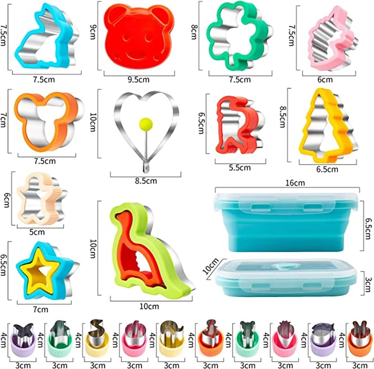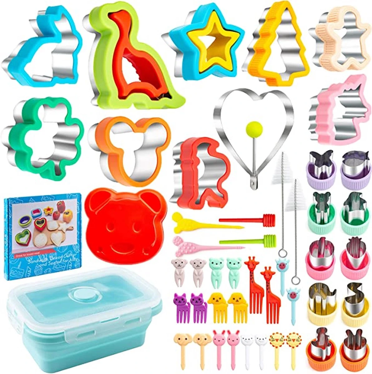 Uitsteekvormpjes set van 48 stuks: de 48 stuks brooduitsteekvormen kunnen aan de behoeften van kinderen voldoen. Bevat: 10 uitsteekvormen (3 grote, 7 middel), 10 groente- en fruituitstekers, 1 opvouwbare lunchbox, 1 liefdes-omelet, 4 cactus-fruitvorken, 20 fruitvorken voor kinderen, 2 borstels. Bevat peperkoekman, mickey, dinosaurus, kerstboom, hart, ster.