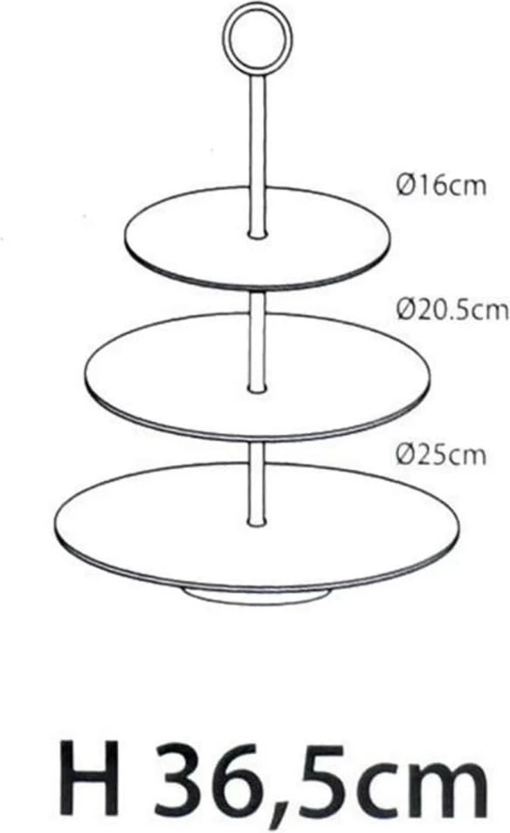 De etagere beschikt over 3 verdiepingen met een diameter van 16cm, 20.5cm en 25cm.