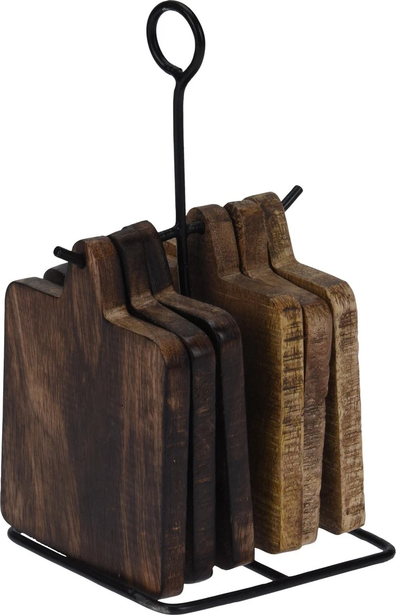 Deze leuke set houten onderzetters hebben de vorm van een kleine snijplank. Door de houder kunnen de onderzetters handig opgeborgen worden. Het is altijd makkelijk om een setje onderzetters op tafel te hebben staan, daar is deze set dus ideaal voor. De set bestaat uit 6 onderzetters en 1 houder.