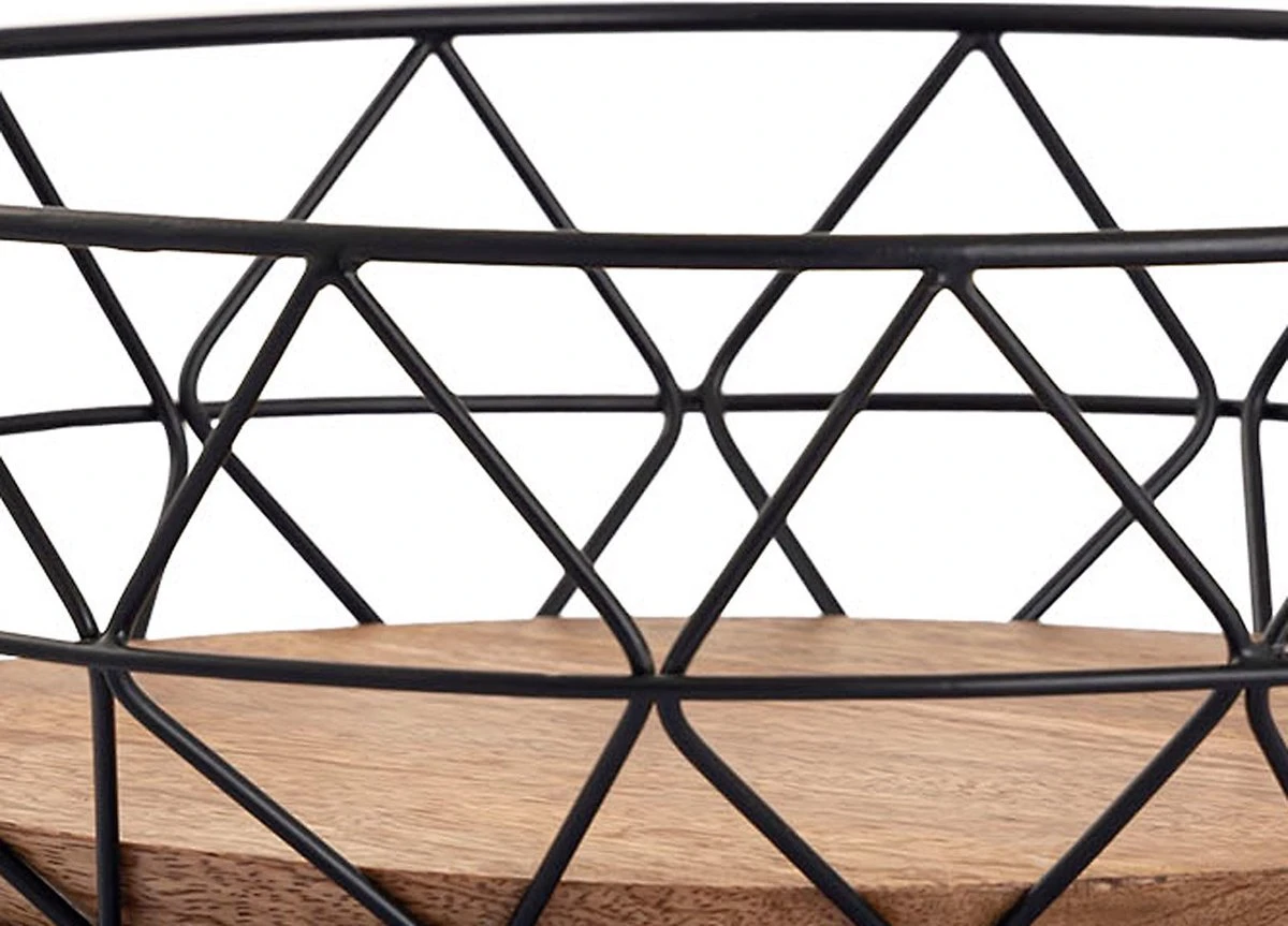 Fruitschaal met de hand gevormd uit metaaldraad met hoogwaardige afwerking en massief mangohout gelakt onderstel
