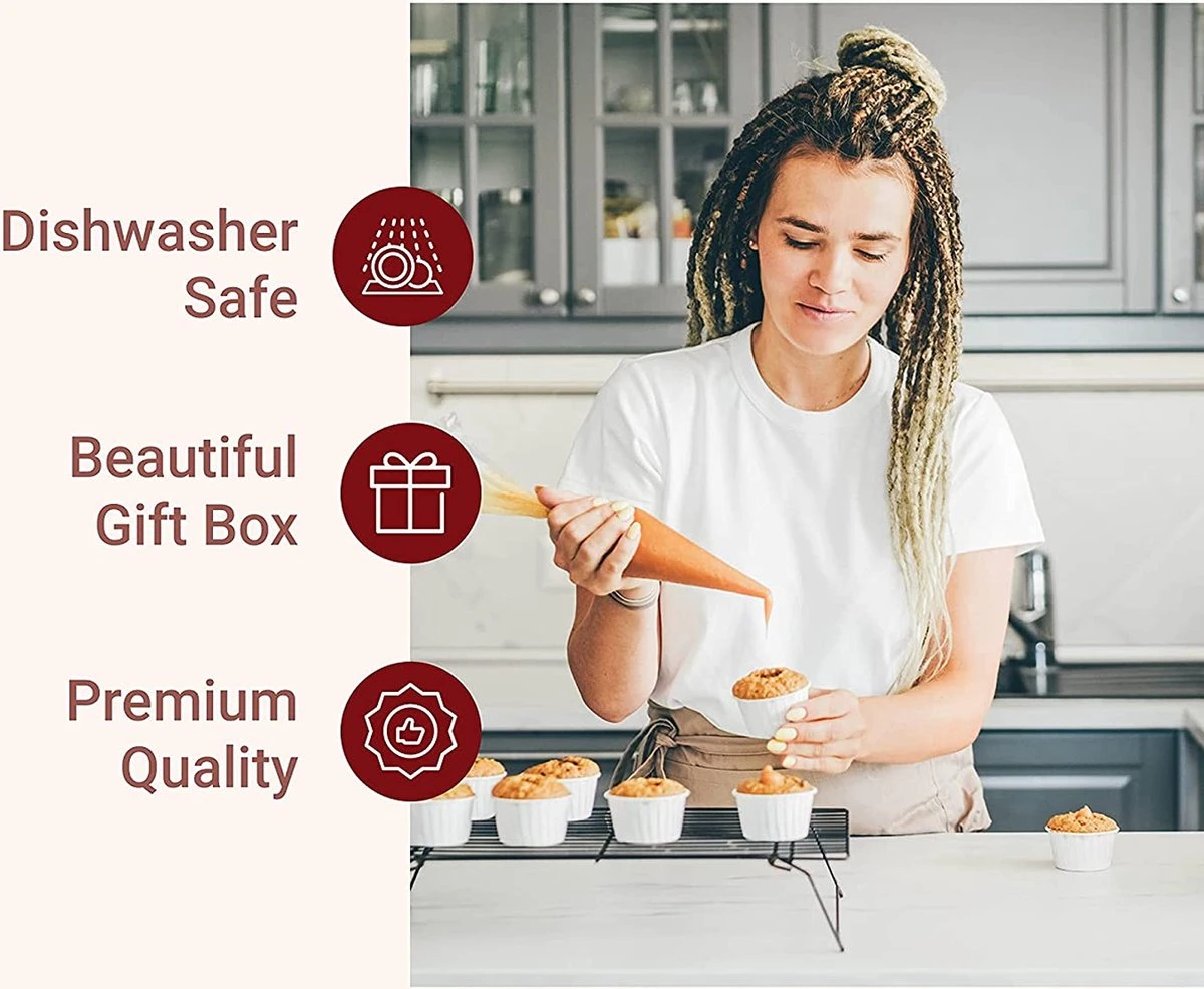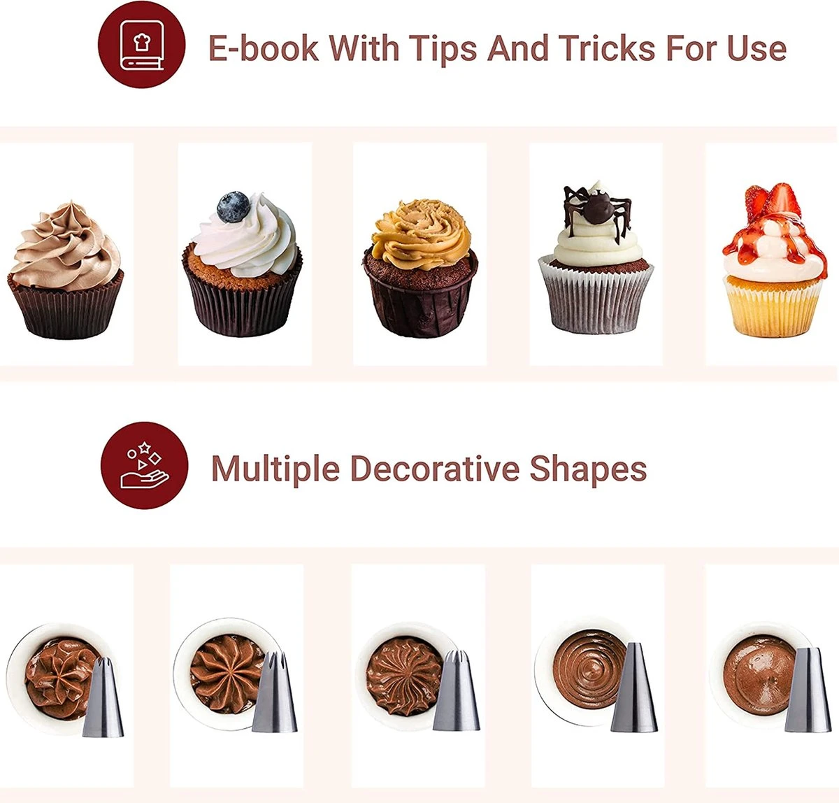 Vele mogelijkheden – De set bevat extra grote spuitmonden om niet alleen taarten en cupcakes te versieren met room, maar ook om gebakken goederen te vullen, bijv. donuts, pralines, spuitgebakjes.