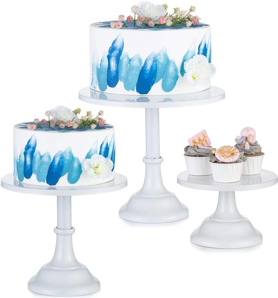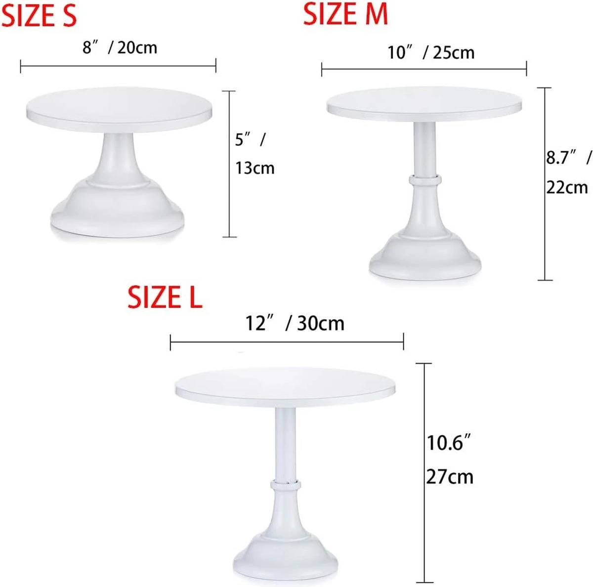 - PACKAGE INCLUDES: 3pcs metal cake stand. (cakes in the pictures are to show. They are not included in the package). Size:Small:8″/ 20cm diameter, 5″ / 13cm height; Medium:10″/ 25cm diameter, 8.7″/22cm height; Large:12″/30cm diameter, 10.6″/27cm height.