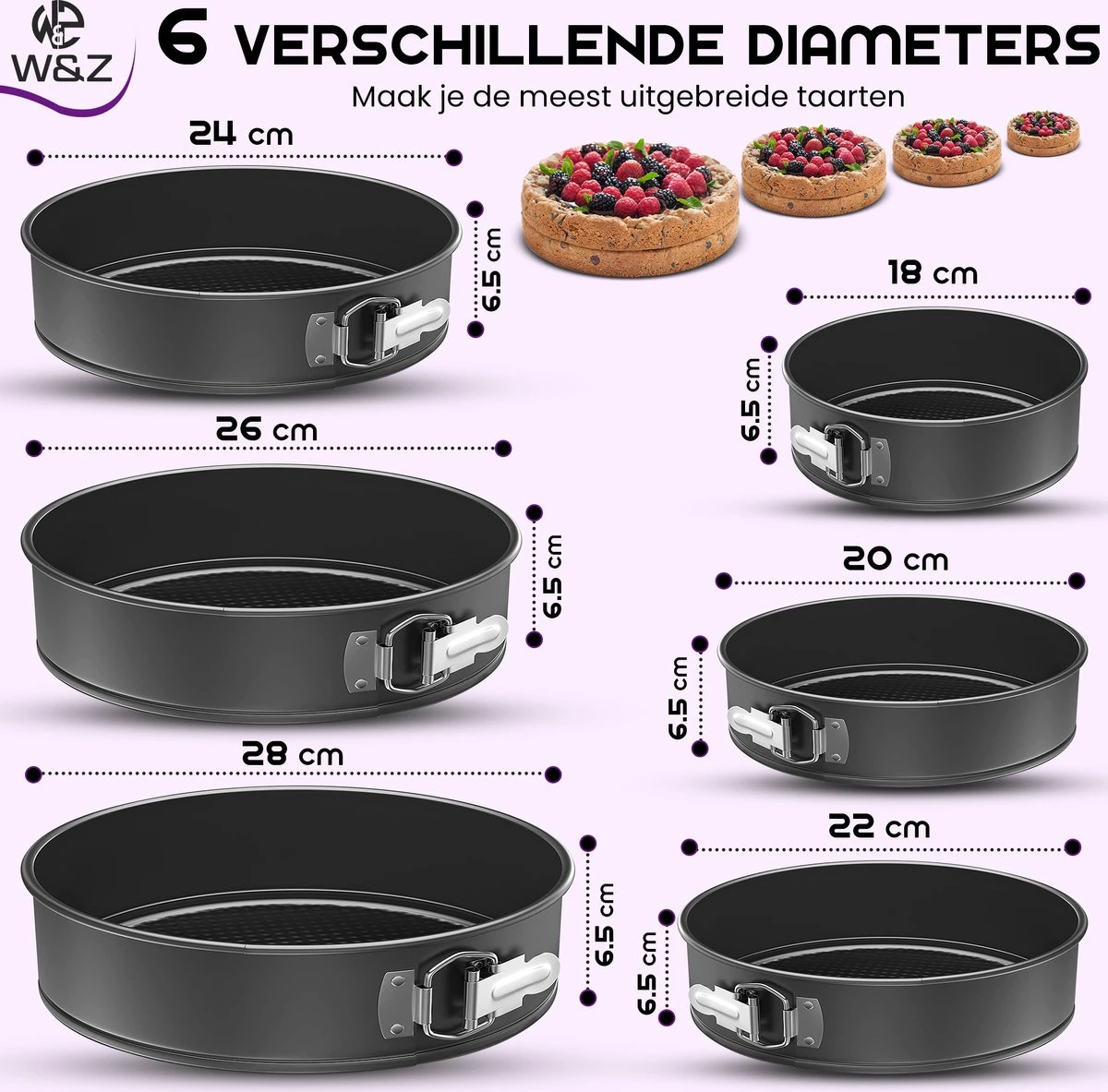 Met de 6-delige springvorm set van W&Z ben je niet aan één formaat taart gebonden. Wil je een keer een grotere taart maken en een andere keer een wat kleinere taart? Geen probleem! Want dankzij de zes springvormen met verschillende diameters kun je taarten in allerlei groottes maken. Kies tussen bakvormen in diameters van 18/20/22/24/26/28.